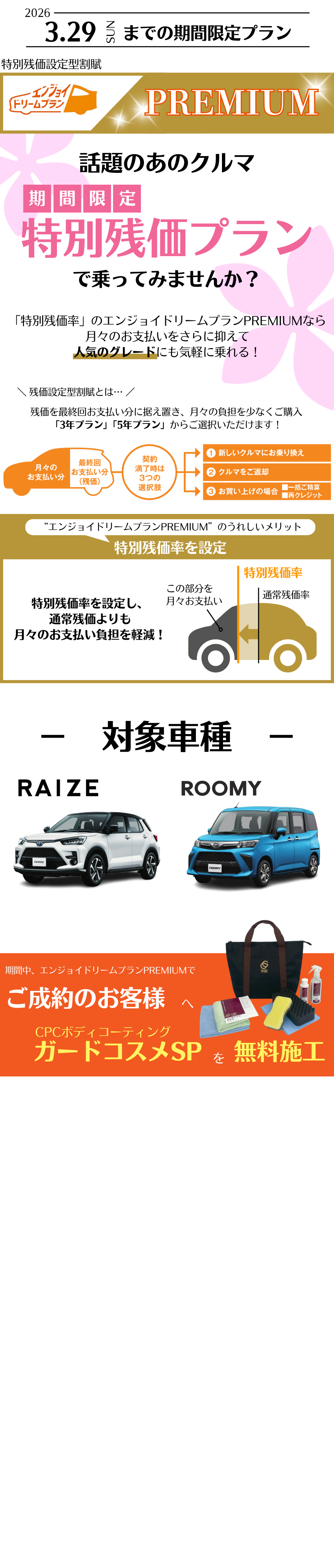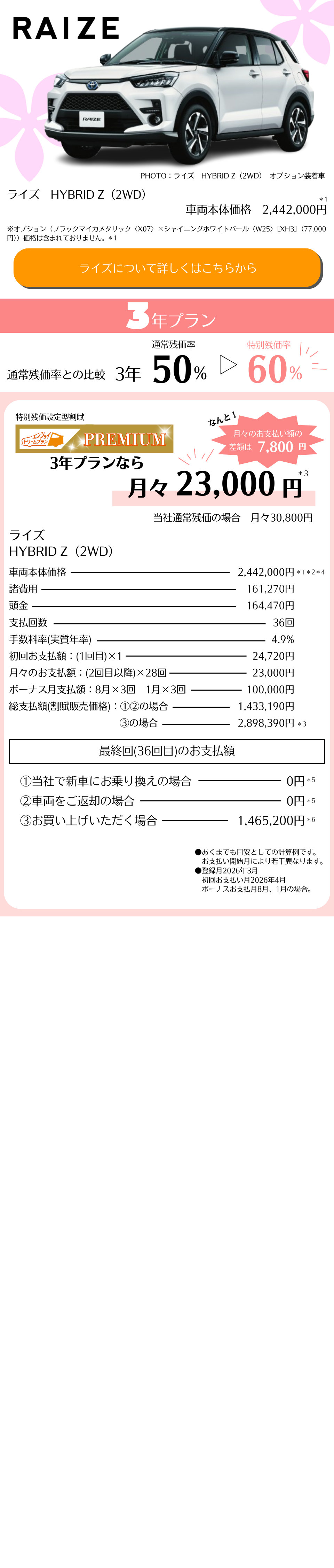 *1.■車両本体価格にはオプション価格(ライズ:ブラックマイカメタリック〈X07〉×シャイニングホワイトパール〈W25〉[XH3](77,000円))は含まれておりません。■価格は消費税10%込み<2025年12月現在のもの>です。*2.車両本体価格はタイヤパンク応急修理キットまたはタイヤ交換用工具を含む価格です。■保険料、税金(除く消費税)、登録費用などの諸費用、納車用燃料代は頭金に含まれております。■ボディカラーは撮影、表示画面の関係で実際の色とは異なって見えることがあります。また、実車においてもご覧になる環境(屋内外、光の角度等)により、ボディカラーの見え方は異なります。■自動車リサイクル法の施行により、リサイクル料金が別途必要となります。