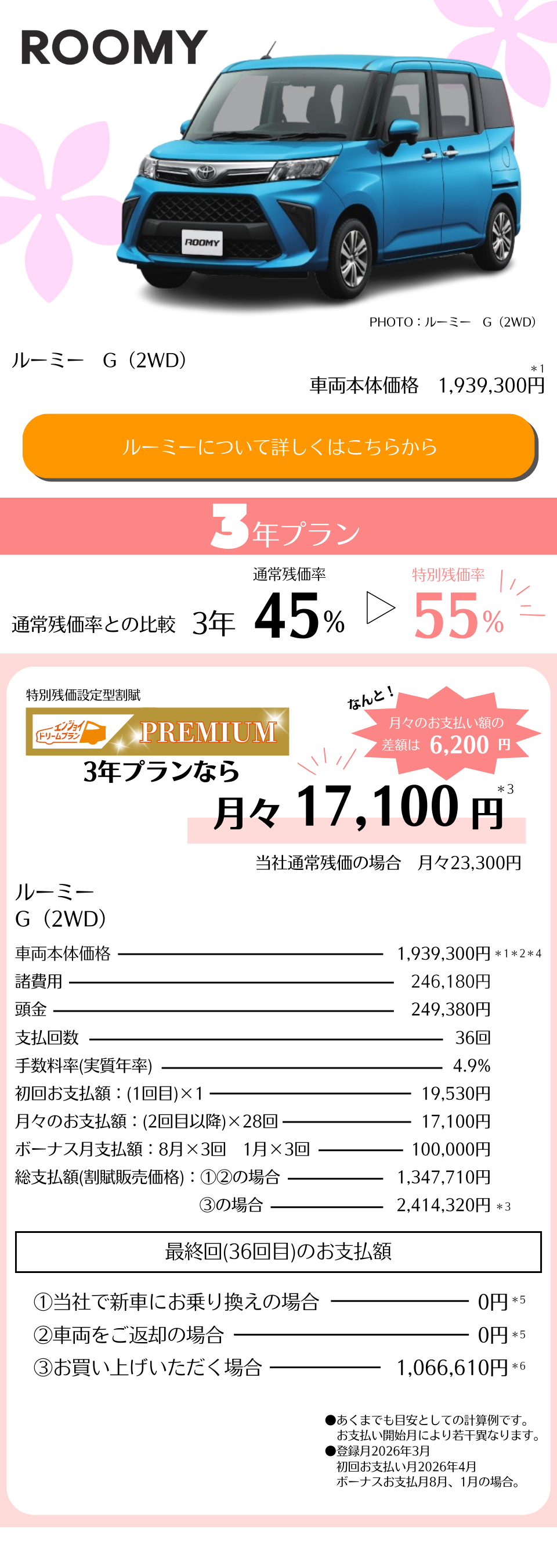 *3.掲載のお支払い例はあくまでも計算例であり、実際の契約内容によっては異なることがあります。*4.算出例の車両本体価格には付属品・オプション代・保険料・税金(除く消費税)・登録に伴う諸経費、リサイクル料金は含まれておりません。*5.ご購入いただいた車両を当社にご返却の上、新車にお乗り換えの場合(①)、及び車両を当社にご返却の場合(②)、最終回のお支払いは不要ですが、車両状態が事前に定めた規定外である場合には別途清算金をいただきます。*6.車両をお買い上げの場合(③)、一括ご精算または分割(別途分割手数料が発生いたします)も選択できます。分割を選択する場合は、別途条件がございます。■残価設定型プランの最終回でお買い上げ(③)をご選択された場合、最終回のお支払い額(残価)を含めたお支払い総額(割賦販売価格)は、一般的なクレジットの方が軽くなる場合があります。■掲載の内容は2025年12月現在のものです。詳しくはスタッフにお問い合わせ下さい。