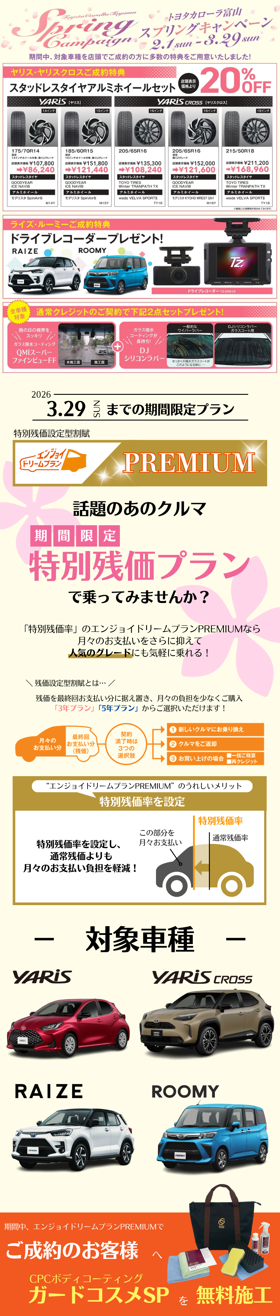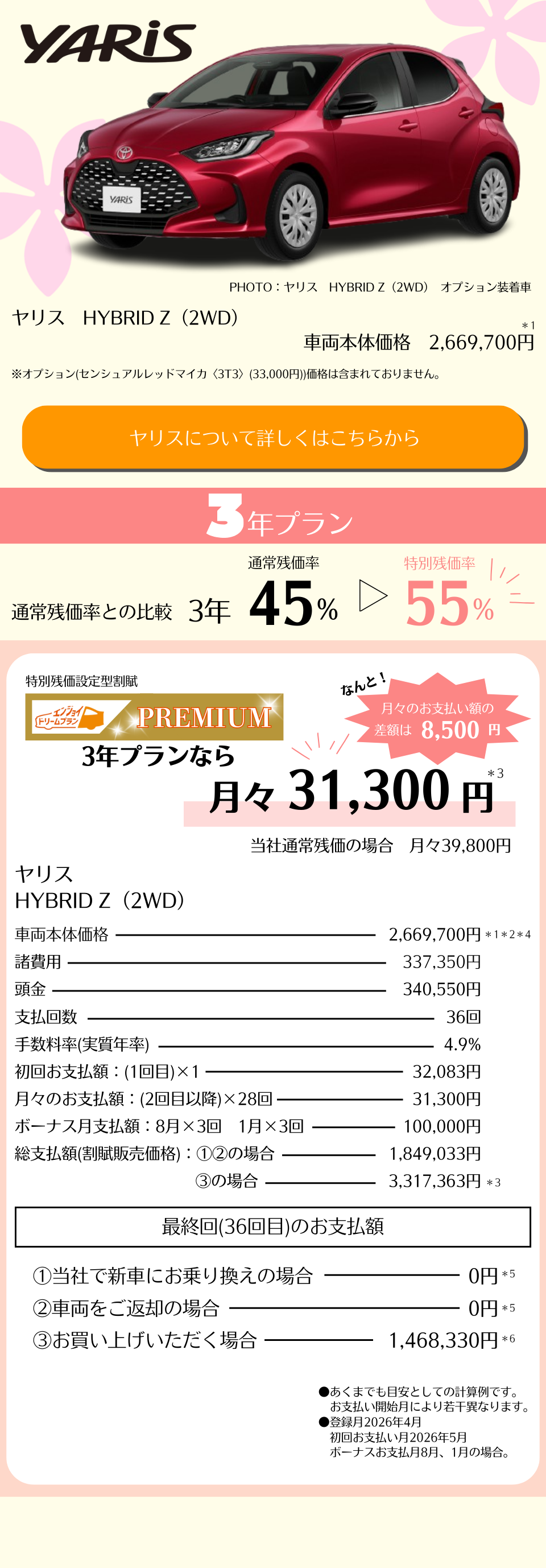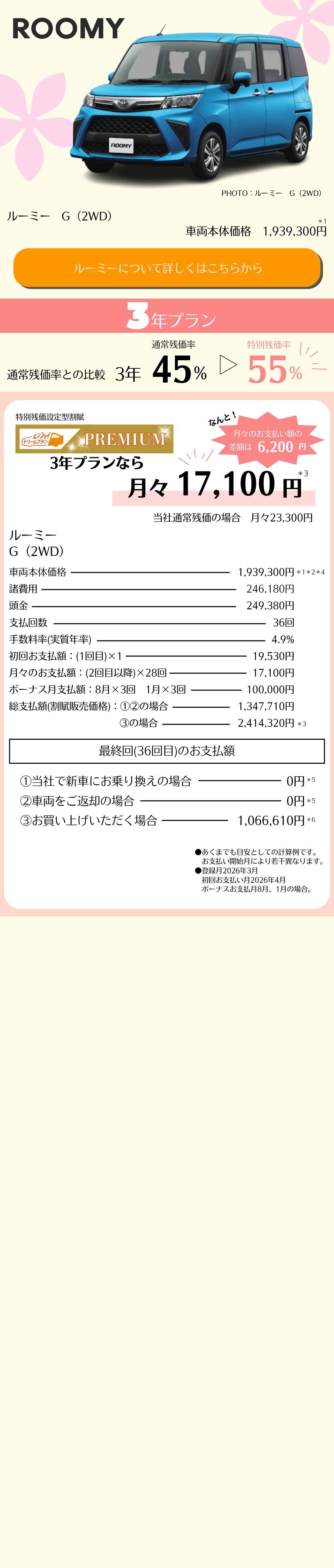 *1.■車両本体価格にはオプション価格は含まれておりません。■価格は消費税10%込み<2026年2月現在のもの>です。*2.車両本体価格はタイヤパンク応急修理キットまたはタイヤ交換用工具を含む価格です。■保険料、税金(除く消費税)、登録費用などの諸費用、納車用燃料代は頭金に含まれております。■ボディカラーは撮影、表示画面の関係で実際の色とは異なって見えることがあります。また、実車においてもご覧になる環境(屋内外、光の角度等)により、ボディカラーの見え方は異なります。■自動車リサイクル法の施行により、リサイクル料金が別途必要となります。