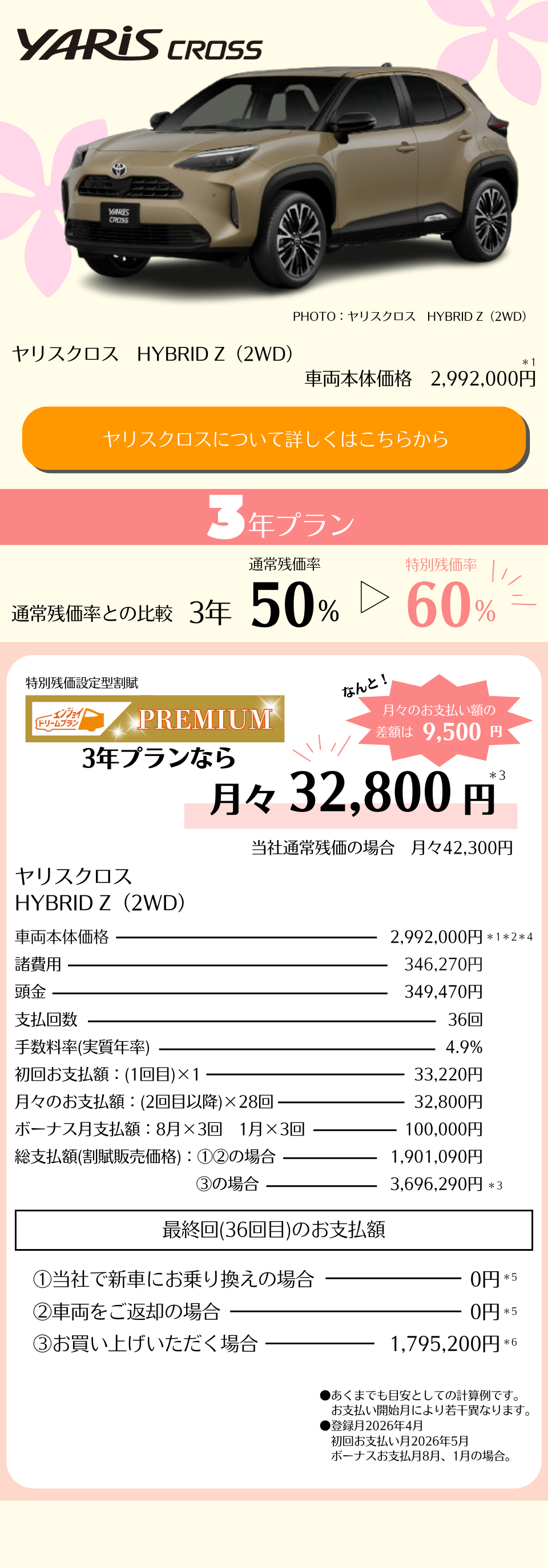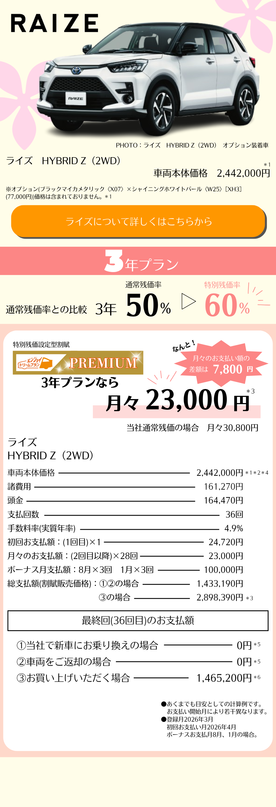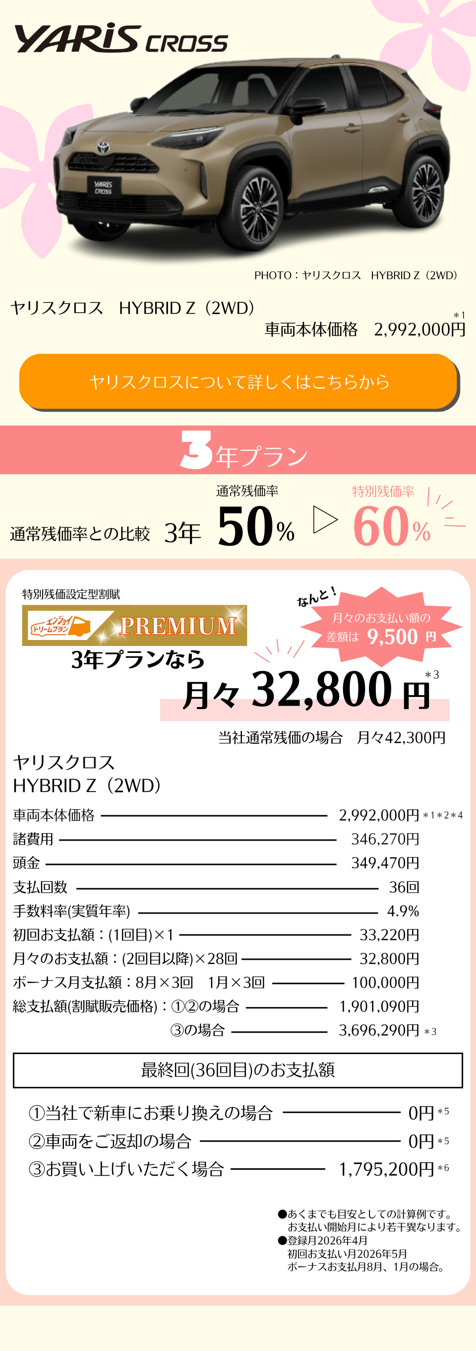 *3.掲載のお支払い例はあくまでも計算例であり、実際の契約内容によっては異なることがあります。*4.算出例の車両本体価格には付属品・オプション代・保険料・税金(除く消費税)・登録に伴う諸経費、リサイクル料金は含まれておりません。*5.ご購入いただいた車両を当社にご返却の上、新車にお乗り換えの場合(①)、及び車両を当社にご返却の場合(②)、最終回のお支払いは不要ですが、車両状態が事前に定めた規定外である場合には別途清算金をいただきます。*6.車両をお買い上げの場合(③)、一括ご精算または分割(別途分割手数料が発生いたします)も選択できます。分割を選択する場合は、別途条件がございます。■残価設定型プランの最終回でお買い上げ(③)をご選択された場合、最終回のお支払い額(残価)を含めたお支払い総額(割賦販売価格)は、一般的なクレジットの方が軽くなる場合があります。■掲載の内容は2026年2月現在のものです。詳しくはスタッフにお問い合わせ下さい。