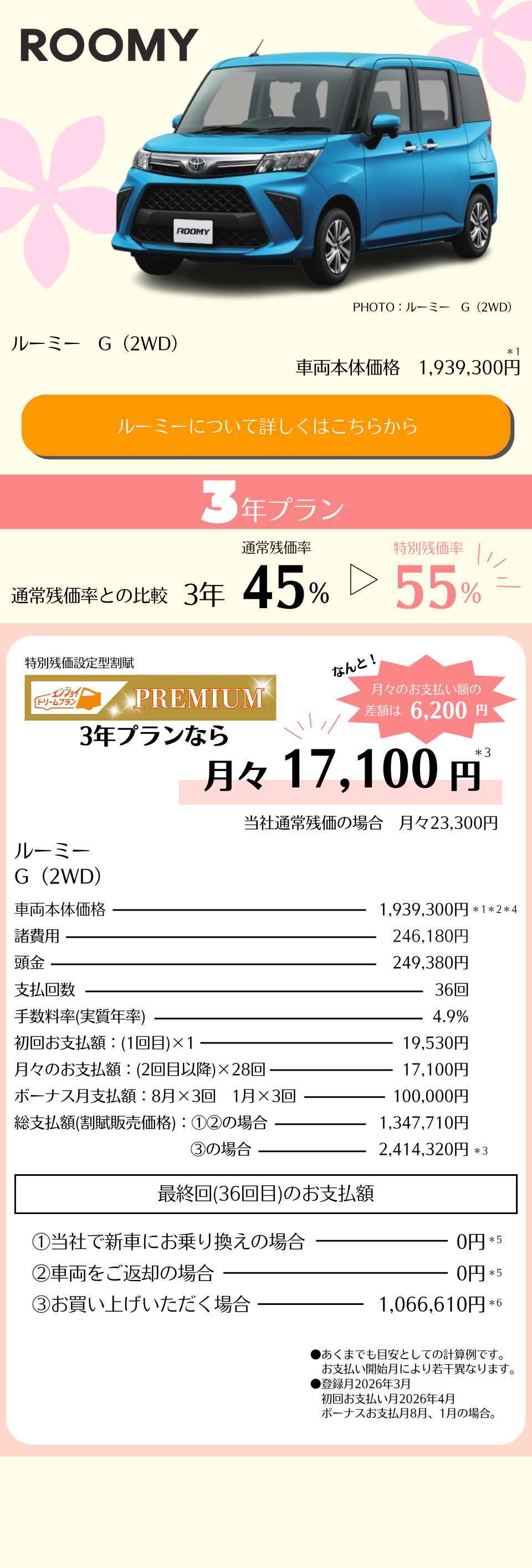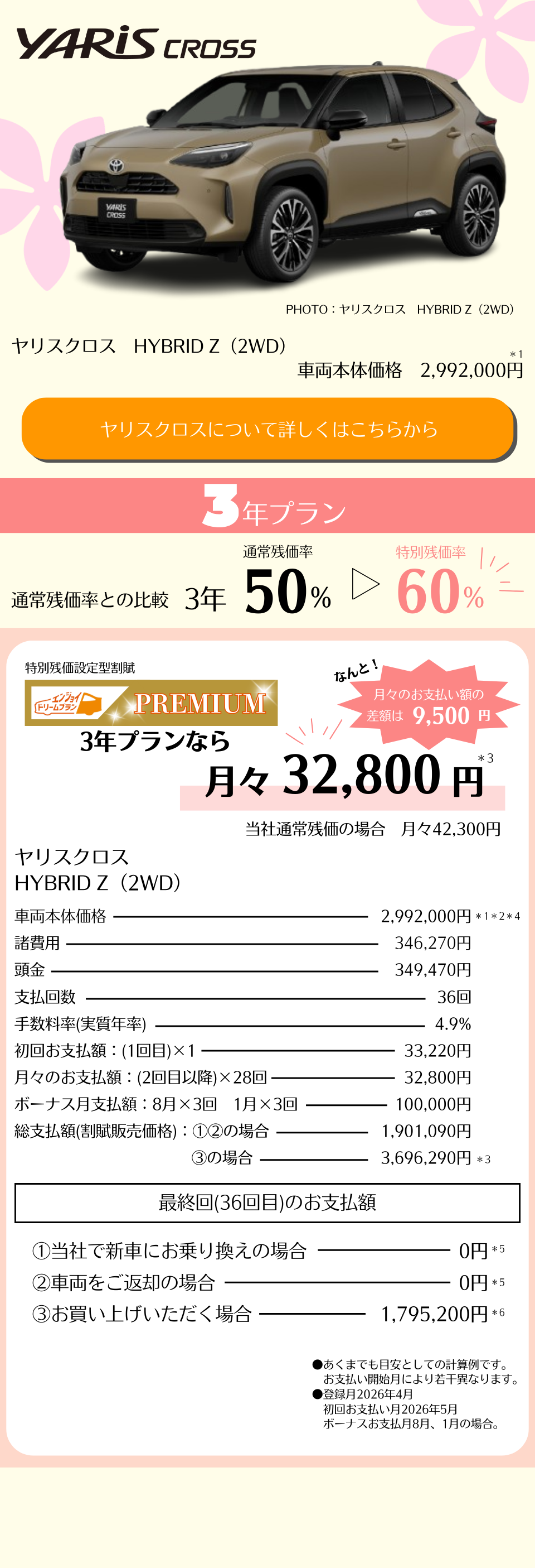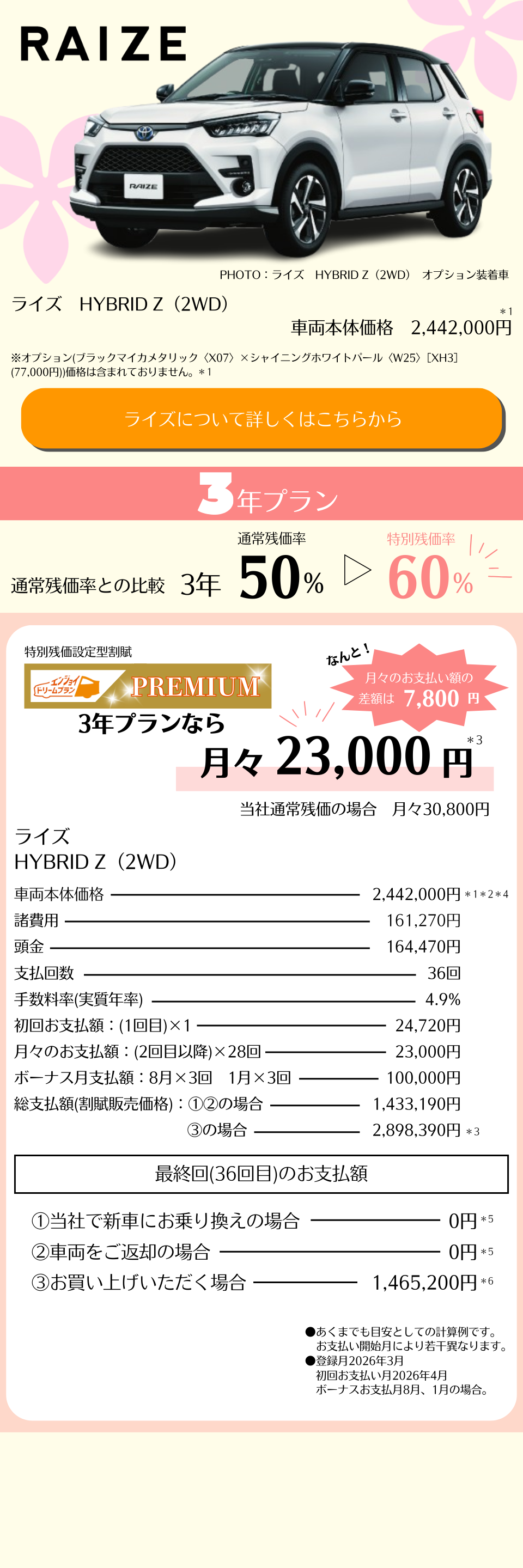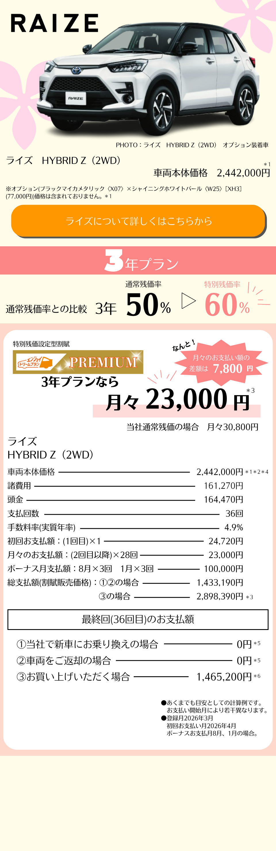 *3.掲載のお支払い例はあくまでも計算例であり、実際の契約内容によっては異なることがあります。*4.算出例の車両本体価格には付属品・オプション代・保険料・税金(除く消費税)・登録に伴う諸経費、リサイクル料金は含まれておりません。*5.ご購入いただいた車両を当社にご返却の上、新車にお乗り換えの場合(①)、及び車両を当社にご返却の場合(②)、最終回のお支払いは不要ですが、車両状態が事前に定めた規定外である場合には別途清算金をいただきます。*6.車両をお買い上げの場合(③)、一括ご精算または分割(別途分割手数料が発生いたします)も選択できます。分割を選択する場合は、別途条件がございます。■残価設定型プランの最終回でお買い上げ(③)をご選択された場合、最終回のお支払い額(残価)を含めたお支払い総額(割賦販売価格)は、一般的なクレジットの方が軽くなる場合があります。■掲載の内容は2026年2月現在のものです。詳しくはスタッフにお問い合わせ下さい。